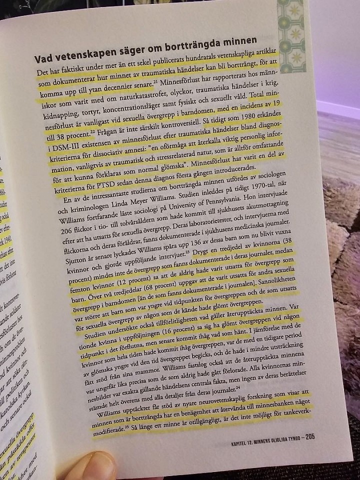Vad vill jag då säga med detta? Jo det är komplicerat men att hävda att minnen inte kan dissocieras bort för att sedan komma upp till ytan många år senare är ren och skär felaktighet. Massor av forskning pekar på detta. Så nu har vi fått hävda oss lite... är som sagt trött på att bli gaslightad att mina minnen och upplevelser är felaktiga. Men det är viktigt att personer runt den traumatiserade inte lägger ord i munnen på hen. Polis och barnahus och domstolar måste verkligen se över hur de intervjuar offer och vittnen. Men det är en helt annan diskussion...